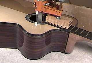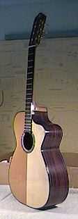 To the right, two views of the guitar, after the neck has been bolted and the fingerboard extension glued. |