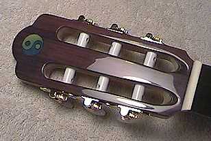 To the right is the slotted peghead, all finished up, the tuners installed. The yin-yang symbol came out kind of nice, huh??? |