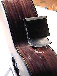 Below, I am gluing the fingerboard extension only, after fastening the two bolts which attach the neck to the soundbox. |