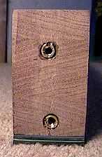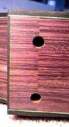 Here are the two holes that go through the neckblock, for the 1/4"-20 hex bolts to pass through. I know, I know...the bottom hole is not on the centerline!!! But not to worry --- when I figured out where to drill the holes in the heel, I figured that mistake in. (If you look back at the picture above, you'll see that the two threaded inserts are not aligned properly, either!!!) |