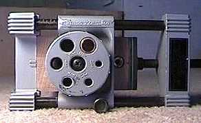 The photos to the left show how I use a doweling jig to drill the two holes for my threaded inserts. This jig ensures that the holes will end up perpendicular to the heel face. I just choose the correct drill bit guide in the wheel, line up the guide with the hole location, and drill the hole with my portable drill. I forgot again to take the pictures as I was actually using the jig, so you see here the heel with the inserts and heelcap already completed. I just wanted to show you how I actually place the heel into the jig.