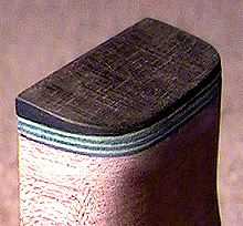 Here's the heelcap. The final green layer of veneer (immediately next to the ebony) will line up with the green side purfling line. The ebony heelcap is cut on a slant, to be in line with the arch of the back. |