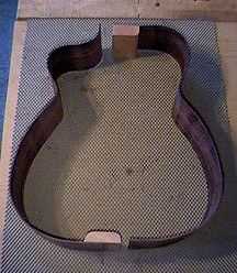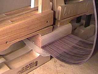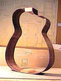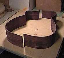 Here I'm gluing the final section of kerfing. I'm using basswood kerfing this time, instead of the cedar kerfing I normally use on the steel strings. I will also put on some side reinforcement strips. |