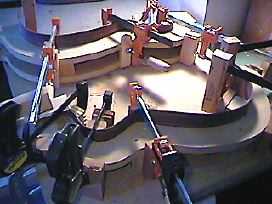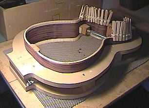 The sides are now out of the mold. The sides here are placed top side down. To the right I'm using four cam clamps to glue the neck block to the non-cutaway side. |