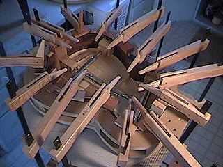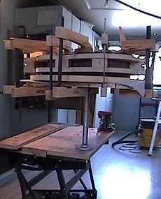 The kerfing has been removed where the top cross braces meet the sides. (Later I will add support braces that run from the brace ends up the side.) Here I'm gluing the top by clamping the sides down upon the top, which is lying on the 25' radius dish. |