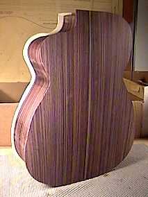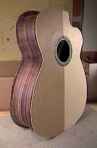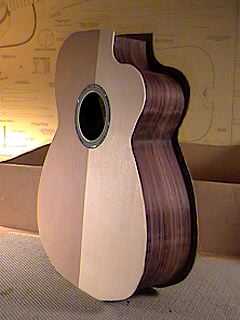 | Here are several views of the soundbox, after the top and back have been glued to the sides. The overhanging wood of the top and back will be trimmed off tomorrow. |