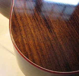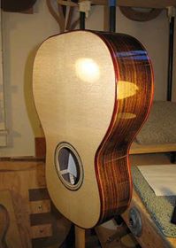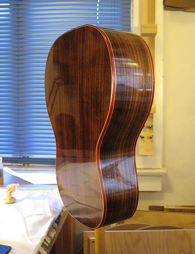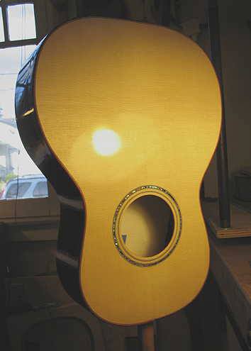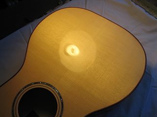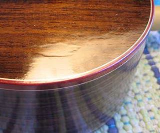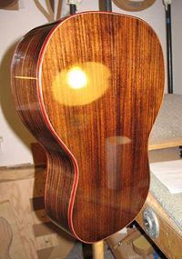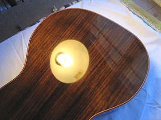 Have been working on the French polishing of my little Size 5 guitar this past week. It's the very first time I've tried this process, and I'm really liking the hands-on process! However, ran into my first problem a couple of days ago --- in trying to use pumice to fill some pores (after laying on the 4th FP coat), I managed to create a little 1" by 1/2" "crater" in the finish! I put a query out in a luthiers' forum for suggestions on how to fix it, and today I tackled the fix, after waiting a couple of days for the finish to harden some more. Working really slowly and lightly, I used walnut oil & 1800-grit Micromesh to level down the area around the crater, followed by one coat of the FP; it took me an hour to do it, but it came out well! (Relief.)