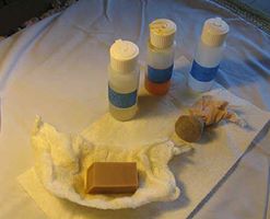 Here are my tools: 2-pound-cut shellac (made from flakes), Everclear grain alcohol, walnut oil, a traditional "muñeca" (made with wool from an old sock and linen from an old shirt), and, finally, an Artgum eraser wrapped in 3 layers of cheesecloth.