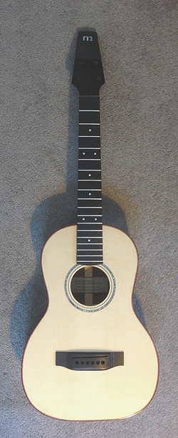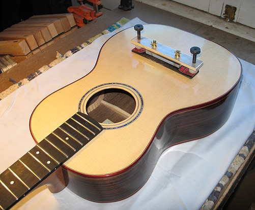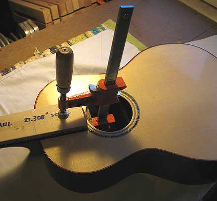 Finally, the fourth photo below is of the bridge-gluing clamp that I used (generously given to me by John Hall, of Blues Creek Guitars) --- for this smaller-sized guitar, it is the only way I had of gluing on the bridge --- all my other clamps were either too long, too short, or too shallow
