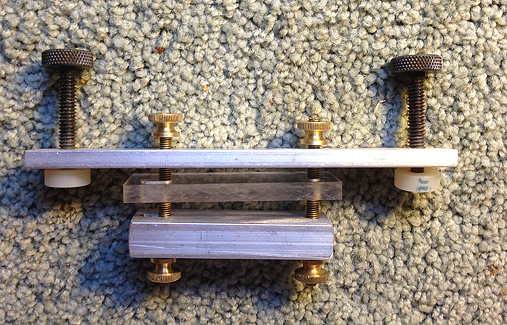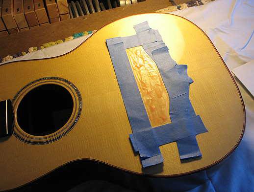 Spent a few hours, first, CAREFULLY figuring out and re-checking (over and over again) exactly where to position the bridge (this is a very crucial step --- a tiny bit off, and you have a guitar that won't play in tune). Once I was confident I had it right, I placed several layers of masking tape outlining the bridge, and, with an Exacto knife, scored about 1/32" inside the outline. Then, i used some orange safe stripper to dissolve the finish within the scored lines, scraping it away with a 1/4" chisel. Finally, I used the bridge-gluing clamp seen below to glue on the bridge.