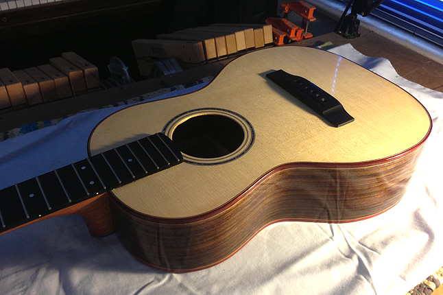 I left the bridge clamp on overnight and removed it this morning. Here's what the guitar looks like now. When I thump on the bridge, it has a really, really clear, resonant tone (a C#, for both the back and the top, if that means anything) --- I think it sounds fuller and better than any guitar I've made so far. I don't know if it's the French polish that has made this difference or not. At any rate, I am going to wait till tomorrow (Monday) to do the rest --- make the nut and saddle, install the tuners, bridge pins, and endpin, and, FINALLY, STRING IT UP!!!! Can't wait to find out what it's going to sound like, compared to my others!!!