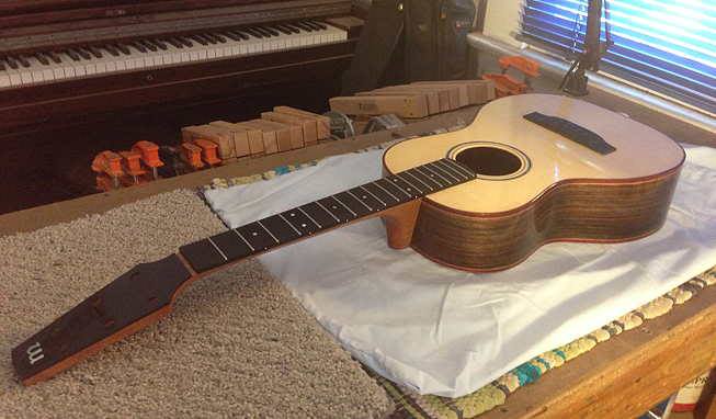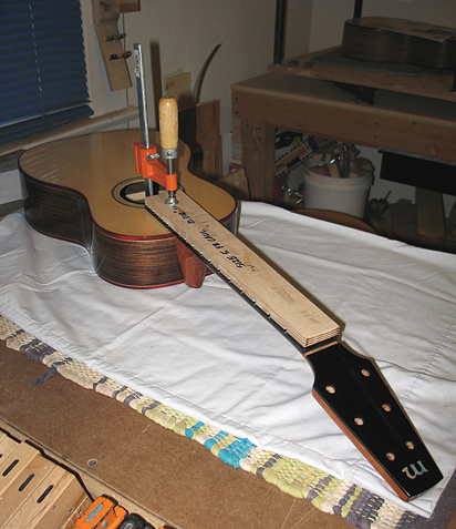 Then spent a few hours removing the finish underneath the fingerboard extension, bolting up the neck and gluing the neck onto the body (just gluing underneath the fingerboard). Everything lines up perfectly (neck back angle, neck centered) -- yay! I will let it sit for an hour and then will remove the clamp.