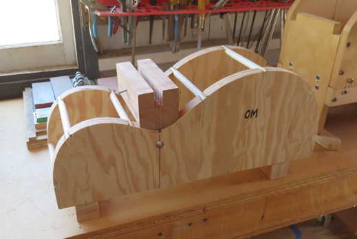 Here is the bending form I made today. I have glued 7/16" wood dowels into the perimeter of the form. I have placed the waist caul on top of the form, so you can see how it fits.