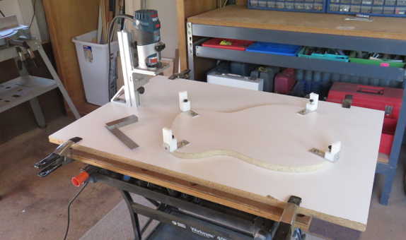 Here's the Stew-Mac binding router jig. I have used melamine board for both the router base platform and the guitar carriage, because the melamine will help it to all slide smoothly on the base as I pass the guitar carriage under the router jig.