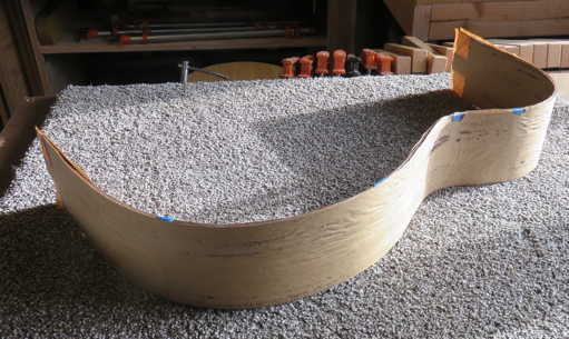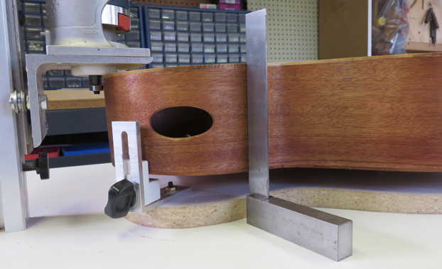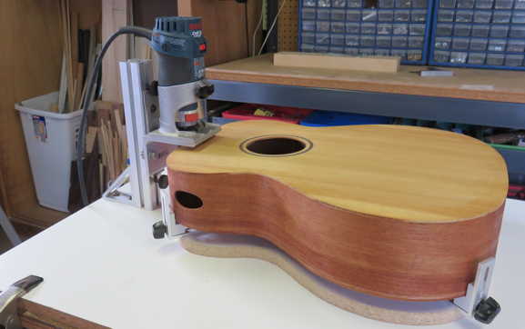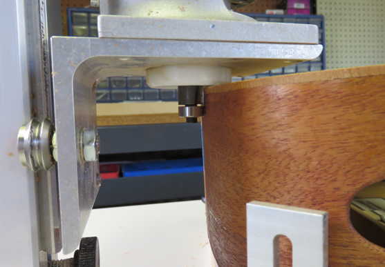 The soundbox is set in the body carriage, which has four adjustable body support blocks. You adjust the blocks first so they hold the body securely in the carriage, and then you adjust the blocks up and down, so that the sides are perpendicular to the table at all points. This adjustment is necessary, because the soundbox has a taper from the tail end to the neck end. If you just let the router rest flat on the top or back surface, the router bit will cut at an angle at the tapered areas of the body (the major taper being at the neck end). The router is perpendicular to the table, so this jig allows you to rout the binding channels (or cut the overhang flush, in this case) perfectly parallel to the sides.