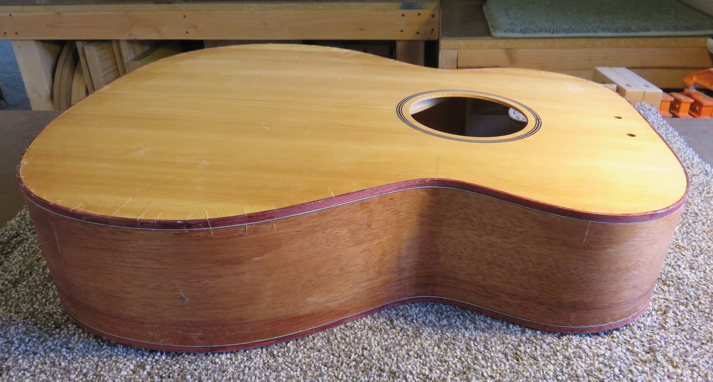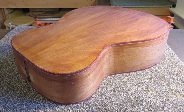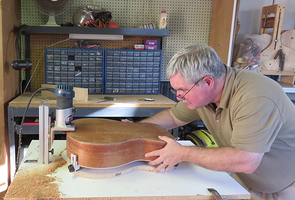 Tonight, Randall used the binding router jig to rout the channels for the top and back binding. Having already used the jig to rout the top and back overhangs flush to the sides, he's an old pro at it now!