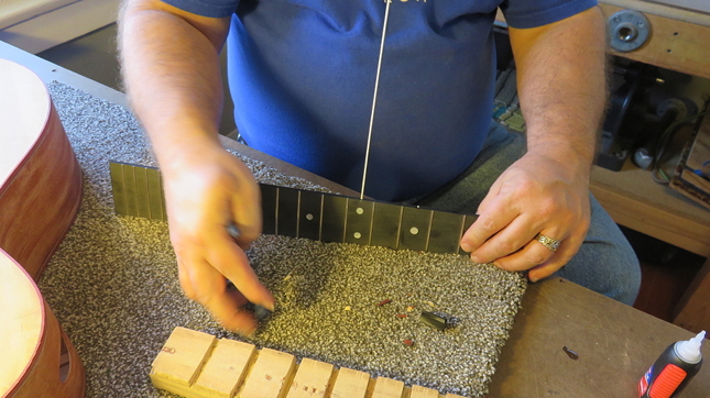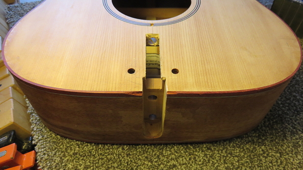The first thing we did was to bolt the neck to the soundbox, clamp the fretted fingerboard onto the neck, lay a straightedge on top of the frets, and measure the distance that that straightedge is from the top of the bridge (placed in its approximate position on the soundboard). When we started, there was around 1/8" airspace between the straightedge and the bridge. So...we had some "flossing" to do!!!