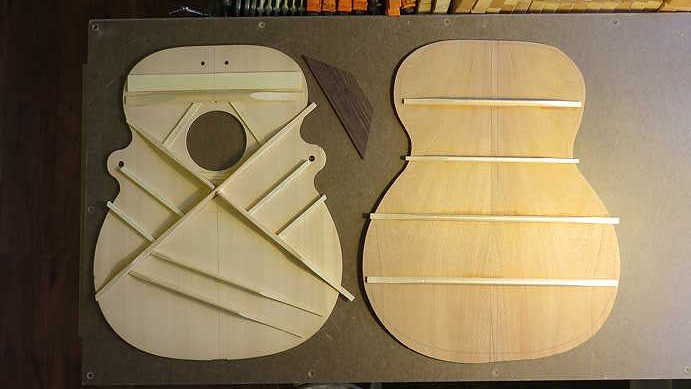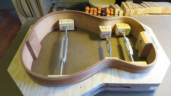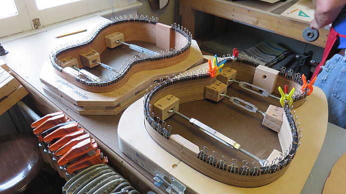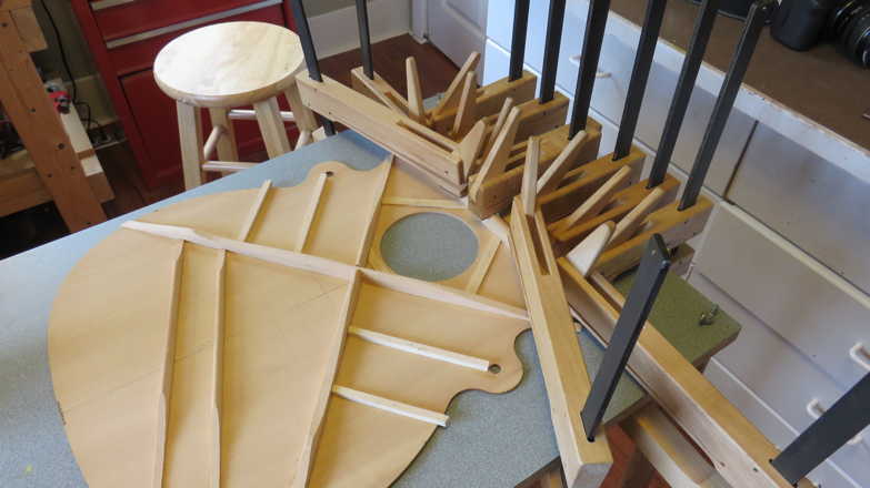 Just a quick couple of photos of where Randall's build stands at the moment; this morning, I removed the clamps from the kerfing on the back edge, the braced back, and the top's two flat braces.