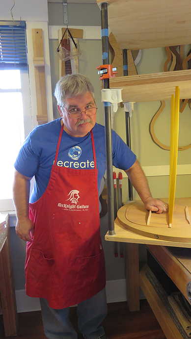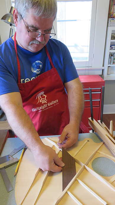 Next is a step I always enjoy, and Randall was a bit surprised that it turned out to be more enjoyable than he had envisioned --- gluing on the kerfing strips to the sides. The triangular-shaped mahogany kerfing strips are glued to the inside top of the sides (here he's doing the kerfing on the back edge of the sides) and provide the gluing surface needed to later glue the back and top to the sides.