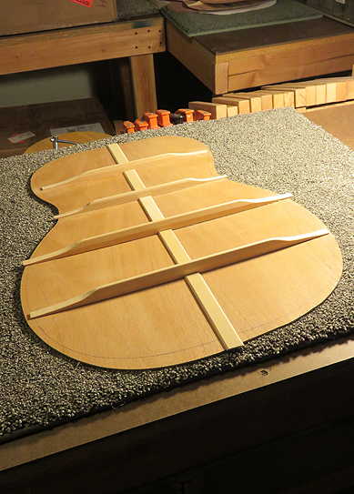 Just remembered last night that I'd better make sure to make the two clamping cauls needed for the top, while the top is still free of the sides. (Don't ask me how I know this.) One of the cauls is used to support the bridge area underneath the top, when you glue on the bridge. The other caul is to support the underside of the fingerboard extension, when you bolt on the neck and glue the fingerboard extension to the top.