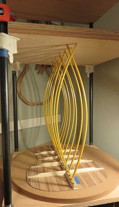 Below, he has glued on the kerfing on the top edge of the sides. Once the clamps (stationery clips, actually) are removed, the side set is extremely stable and holds its proper shape.