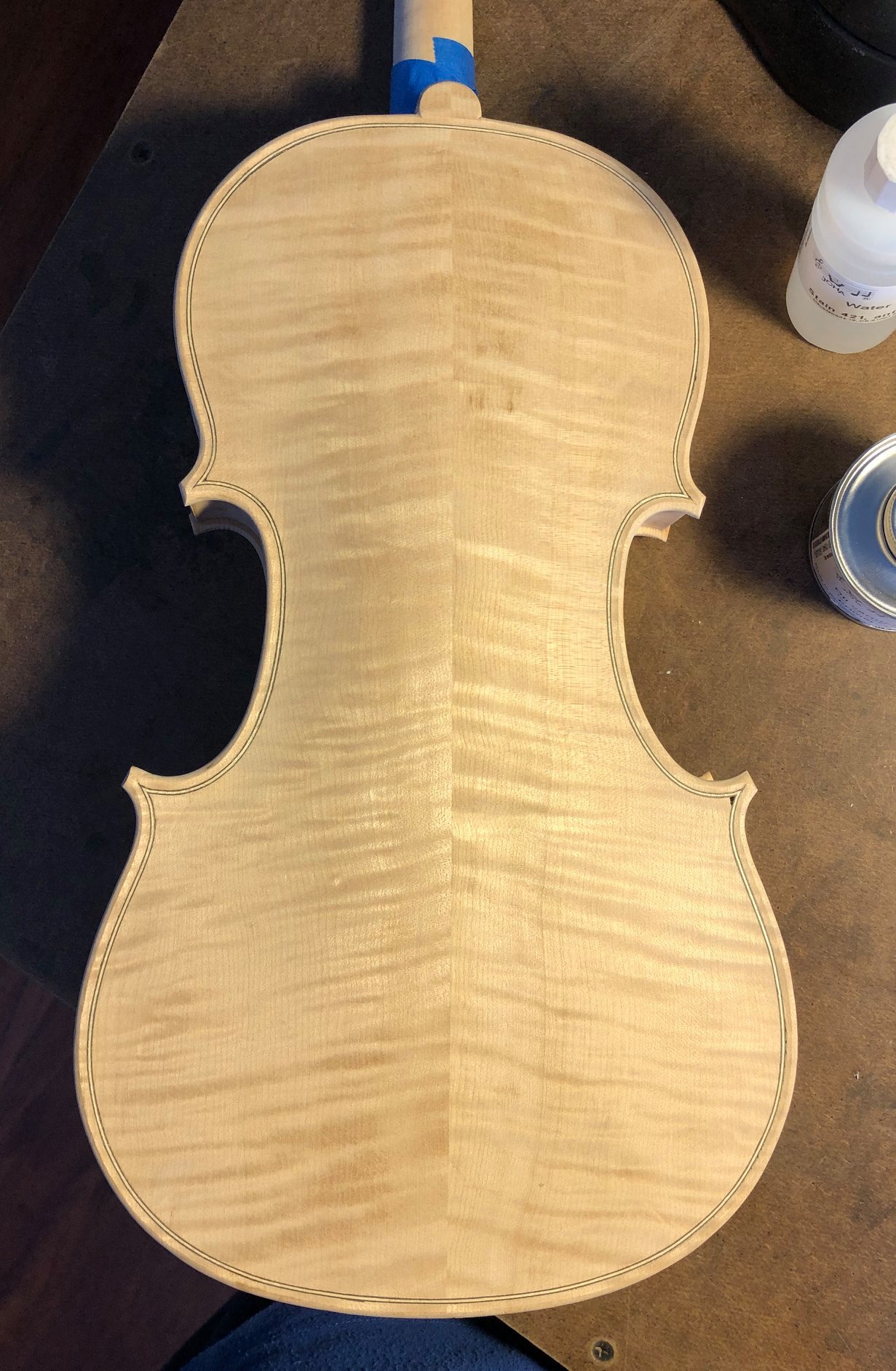 I ordered, off Amazon, another cheap ($90) Chinese violin-in-the-white, with a flamed maple back (because I really do want to see how the oil varnish will bring out the flame). (This violin kit also has all the fixings --- nice boxwood tailpiece, chin rest, and pegs, which is a plus.)