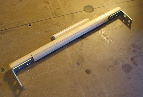 BELOW: After I had glued on the battens, I realized that I wouldn't need to use the L-brackets to attach the snare-rest rod. I cut a new section of the 3/4" dowel and just slightly flattened the two ends of the rod, so they would rest on the underside of the batten. Then I glued those flattened ends to the batten. Later I might screw those two ends into the batten, just to make it a little more secure.