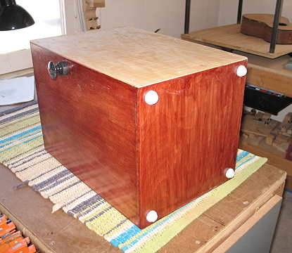 When that is dry, I will apply the felt to the snare-rest dowel, insert the snare-adjustment dowel and screw the snare to it (I think I'm going to put the snare in the left-hand side --- to my left, as I sit on the cajón), and, finally, screw the tapa to the front (drilling pilot holes first).