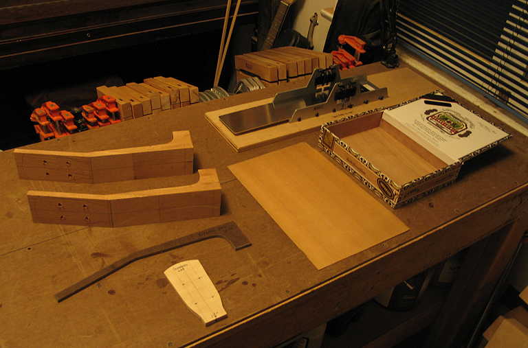 A couple of weeks ago, I met with that teacher again, to touch bases on what we would do with the students this year. I showed him the PowerPoint presentation, and we decided we would show it to the kids and have some sort of question/answer session with the kids afer showing the presentation. GUITAR KIT:Another idea that had come to my mind was to show the kids what a guitar kit looks like, and what it would involve to build one. So....one of my good Internet friends, John Hall of Blues Creek Guitars, very generously sent me a Martin OOO guitar kit, at a very good price. What the teacher and I decided, was that the best thing to do with that would be to show the kids what a guitar kit consists of, and then have the teacher build the kit throughout the semester, as students either observed or helped him build the guitar. CIGAR BOX UKULELES:Finally, since the teacher had earlier commented that many students in the high school had become interested in the ukulele, I came up with the idea of my making up a bunch of cigar box ukulele kits and having interested students build those cigar box ukuleles, with my help. So, in the last week, I started researching the Internet, to see just how cheaply I could make up a kit that the students could afford. After pricing out the variouis materials needed, I figured that the total cost of a kit would be about $40-$45. I deciided that I could offer the kits (put together by me) to the kids for around $35, something they could probably afford. Today I started in earnest on making up a sample completed cigar box ukulele (not having in my possession the one I built back in 2006, because I had sold it to a student), as well as a kit of the components the students would get. I have no idea how many students will be interested in taking part in this cigar box ukulele build. What I will do is, on October 15th, show the students the completed cigar box uke, and the kit, and let them know what their part in building the uke would be, should they decide to participate. I've decided that the parts they would have to do would be to glue on the top brace and bridge patch (I would provide the thinned cedar top with the soundhole cut out), glue in the neck block (I would provide that with the hole drilled out for the bolt, remove the cigar box plywood top and glue on the kerfing and cedar top to the box, do the fretting and leveling of the fingerboard (I would slot and taper the fingerboard), glue the fretted fingerboard to the neck, do the carving of the neck (I would supply the rough neck blank with the threaded insert installed) and install the tuners, shape and install the nut, locate and glue the bridge, and install the saddle (I would supply the slotted bridge), and do the finishing of the top and neck. I would help them with the final setting of the action. So far, on the two kits I am making up as samples, I have almost completed the rough neck blank --- I have glued the scarf joint for the peghead and have glued on the two extra blocks for the heel block. I have made a template for the neck blank shape and have cut out the rough neck shape. I have also made a peghead template, have drawn it on the neck blank, and have drilled out the tuner holes (for the cheap Ping geared tuners I found online). Also in the photo below are the kind of cigar box I will use, next to a thinned Western red cedar top (I received a lot of cedar long ago from another Internet friend, Kevin Pettit). I also just purchased a Stew-Mac fret slotting template for two ukulele scales (a Concert and a Soprano scale); I will use that to hand-saw the slots in the fingerboards.