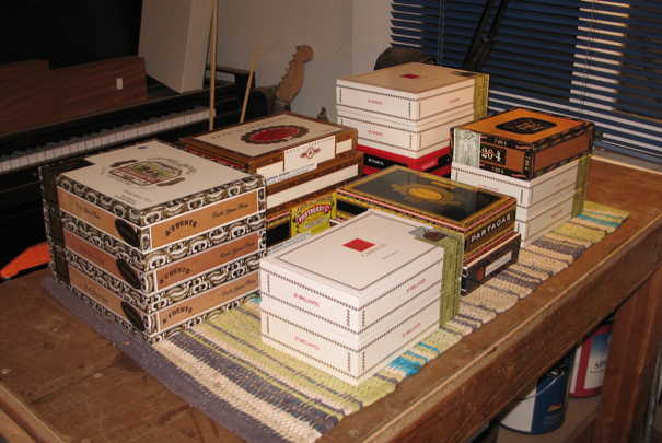 Saturday, October 19th, 2013: Today I embarked on my quest for cigar boxes of suitable size for the ukuleles. Since I need soprano-sized boxes, I was looking for boxes at least 8" to 9" long, and 6" to 7" wide. Visiting around seven cigar stores around San Jose, I found that most shops primarily had only small, cube-like boxes, or had none to sell at all. But I did finally find one cigar shop, West Coast Cigars, in south San Jose, which had a lot of boxes that I could use. The very friendly employee there even gave me a good deal on the boxes ($2.00 each and four free boxes)! I bought fourteen boxes. He said that new cigars arrive weekly, so I could obtain more boxes if I needed them!