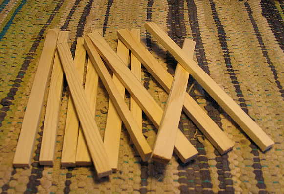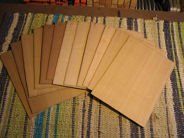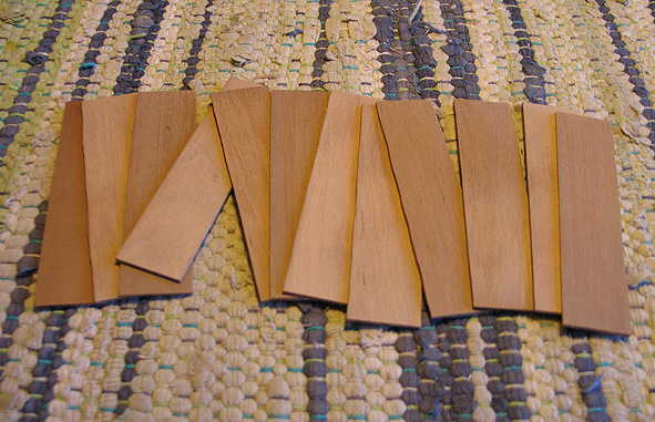 TO THE RIGHT: I have also cut out the 1/4" by 1/2" braces from some spruce scraps I had. Each one had to be sized and labeled for the particular top it would fit (all the cigar boxes are different sizes). |