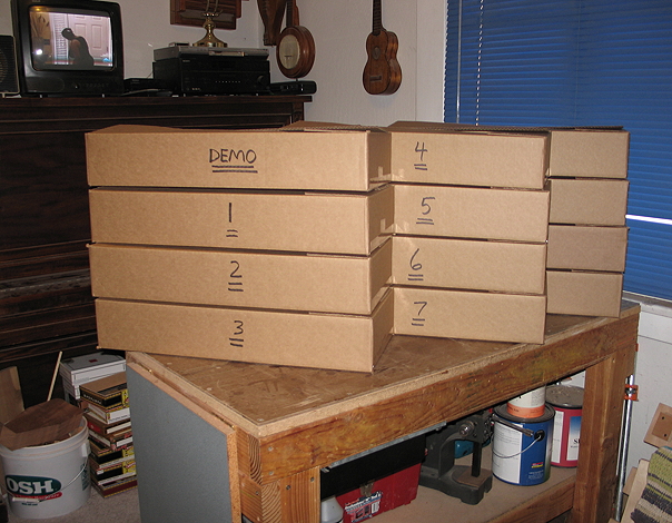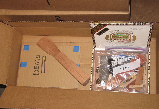 Saturday, January 18th, 2014: Well, THE KITS ARE COMPLETED!! I just finished boxing them up. Each box contains (1) a Western red cedar top (thinned to 1/16", with soundhole cut and brace positions marked), sandwiched between two pieces of cardboard for protection, (2) 28" of mandolin-sized fretwire, (3) a cigar box (of course), and (4) a ZipLoc bag containing all the little parts (strings, 4 wooden beads for the string ends against the bridge plate, Ping tuners, neck block, kerfing, bridge patch, cross brace, bridge, bone nut & saddle blanks, slotted fingerboard with 5 position dots, neck blank with threaded insert & tuner holes drilled, 1/4"-20 hex bolt and washer). Now all that needs to be done is a little instruction manual!