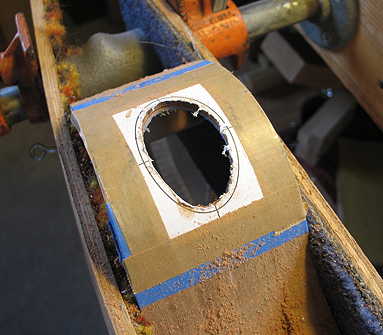 Now that the veneer reinforcement has been glued on the inside, I can rout out the soundport. Here I have glued my paper template onto the blue masking tape stuck on the upper bout; I have also taped the edges of the template, just to make sure it doesn't start to curl up as I am routing.