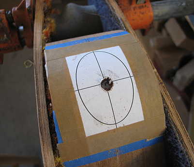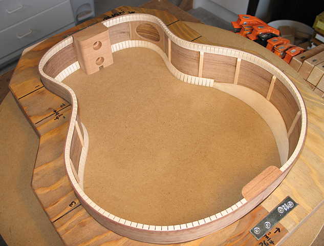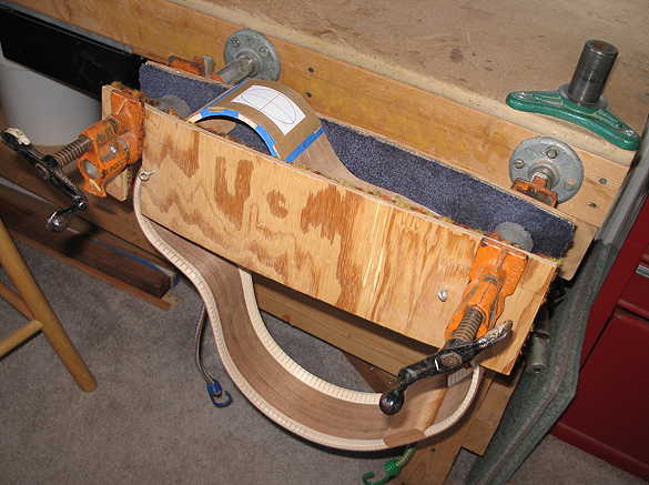 Here I have glued and clamped the veneers. Tomorrow I will cut out the soundport. I plan to make this soundport an oval 2-1/2" long and 1-5/8" wide.