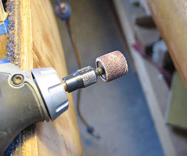 | To the right is the 1/8" downcut spiral bit I am using with the Dremel, to rout out the soundport. |