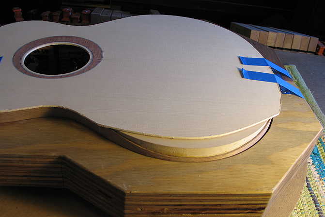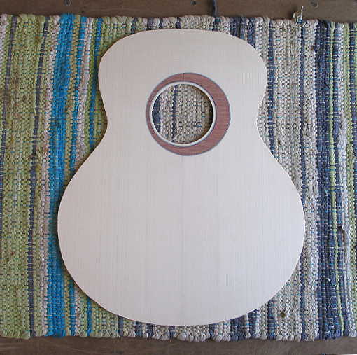 (2) Then I took it to the thickness sander, first sanding (with 120 grit on the drum) just enough to get the rosette truly flush to the spruce, so that all the purfling lines were nice and crisp.