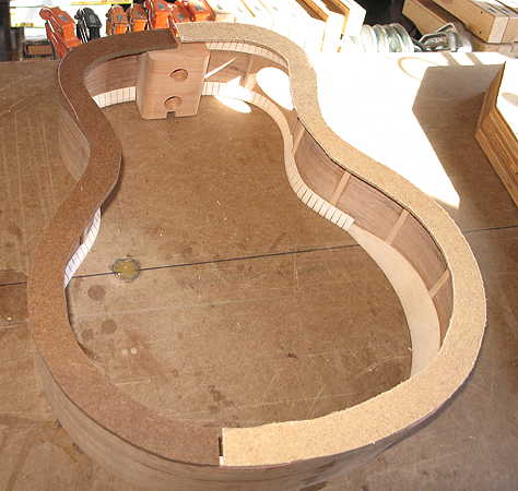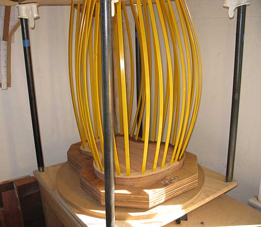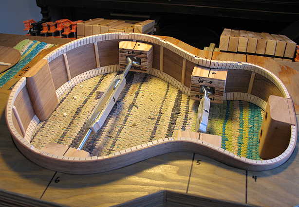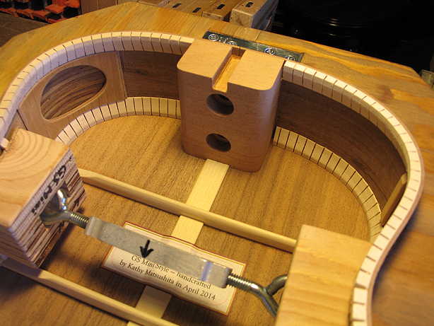 I LOVE MY GO-BAR DECK: (1) The fact that its upper deck is adjustable with four pipe clamp thingies means that I was able to make the upper deck one height for the lower bout of the back (which is higher than the neck end), and a lower height for the upper bout. This allowed me to have even clamping pressure all around, without having to use extra blocks at the neck end. And (2) The fact that it swivels out and around means that I am easily able to get to all the areas as I'm applying the go-bar sticks. It also makes it super-easy to check and adjust the neck and tail centerlines, so it all lines up properly.