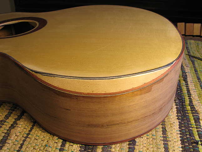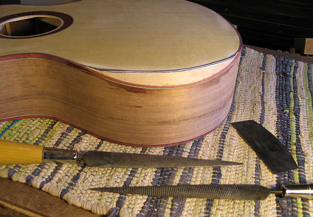I then used the "Dragon Rasps" (coarse and fine -- the flat sides) seen in the photo to the right to do the filing ---- I love these rasps, because they cut so easily and smoothly, compared to my "four-in-one" rasp. When I got to where the bevel was just about flat, I switched over to my scraper, to smooth it all up and to make the edges of the bevel (right at the black purfling line) nice and sharp. (Even though you see more than the original three black/white/black purfling at the edge of the top in the photo below, those extra white and black lines you see at the bottom are actually just part of the flat bevel surface --- the sharp edge of the bevel is actually above those extra lines. The same goes for the binding you see at the bottom of the bevel --- the sharp edge of the bevel is below the binding, where the purfling begins.)