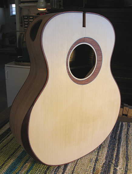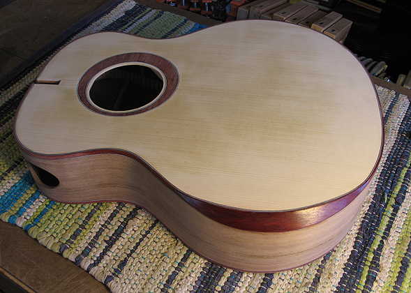 SO . . . here I have applied glue to both the bevel surface and the bloodwood veneer (cut oversized, to be sure that it will cover then entire curved bevel area). In an hour or so, I will first lightly scrape off any nibs that might have fallen into the glue, and will lightly sand the surfaces (because the Titebond will probably raise the grain a little), before I iron on the veneer.
