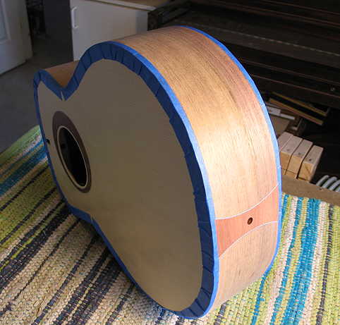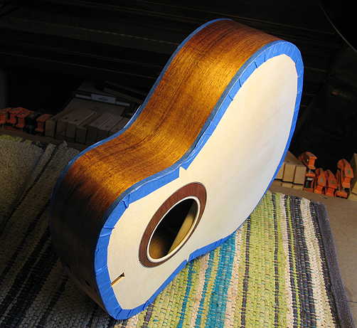 About 1:00 p.m. : The Z-poxy on the rosette was dry enough that I could lay the soundbox with the top down (waxed paper underneath), so I was able to pore-fill the back. (I had removed the blue masking tape from the bindings on that side and had masked the back binding/purfling with some thin white tape.) Here's a shot of the back and the side that has been pore-filled already: