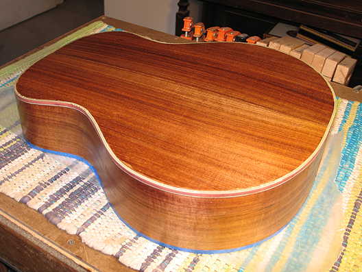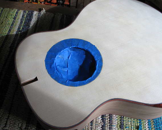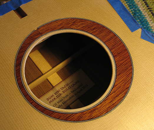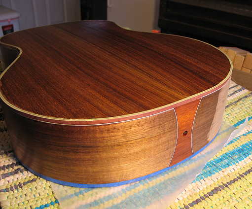 Tomorrow, after taping off areas (like the spruce directly around the rosette), I will begin the pore-filling process. I will need to pore-fill the bloodwood rosette, the Mayan walnut back and sides, and the mahogany of the neck. I plan to use Z-poxy for the pore-filling; it will probably take at least two coats, if not more. |