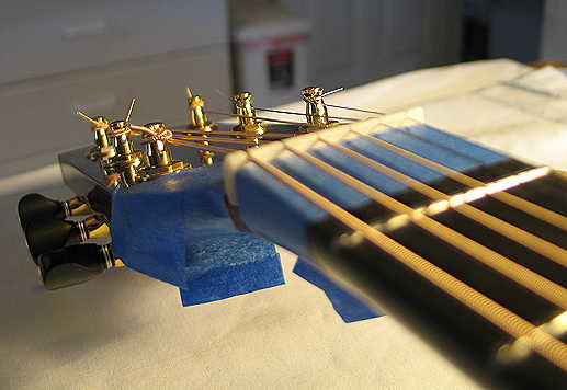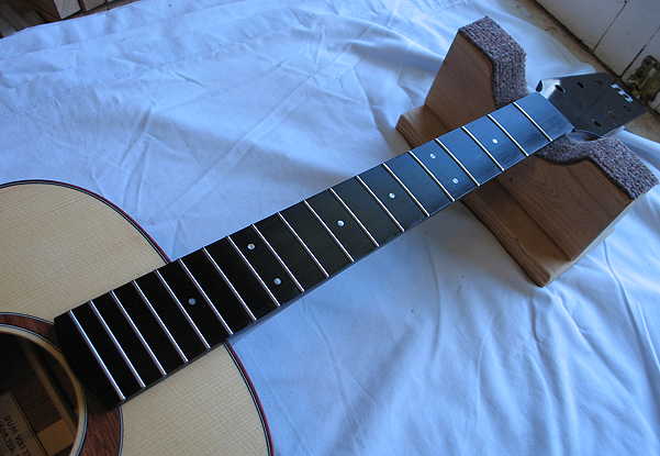 I then removed the masking tape, did a little resanding of the fingerboard ebony (to remove the slight markings of the tape residue), and repolished it with lemon oil.
