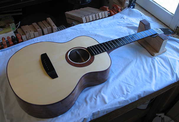 Here's what the guitar looks like now, with its bridge glued on and its newly-polished fingerboard: