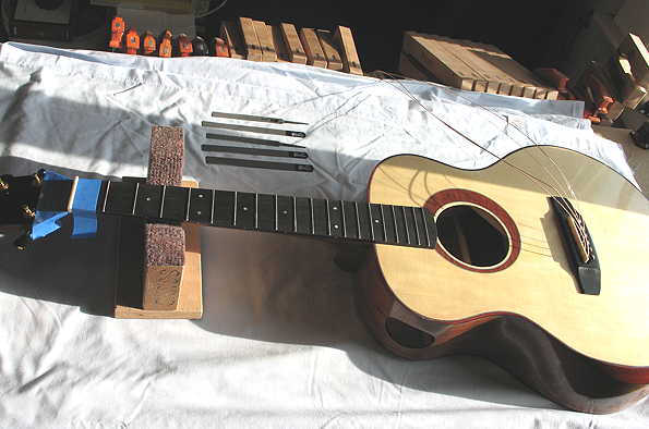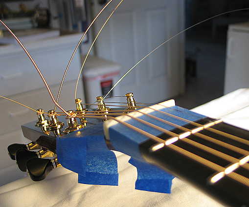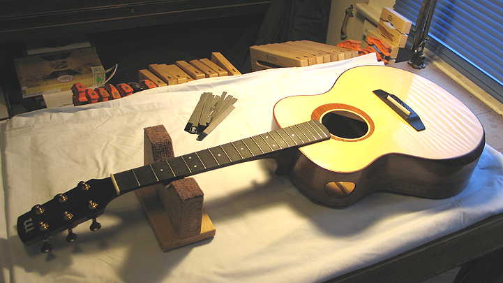 I'm taking a dinner break right now. This afternoon I did all the preliminary tasks for readying the guitar for stringing it up and doing the set-up.