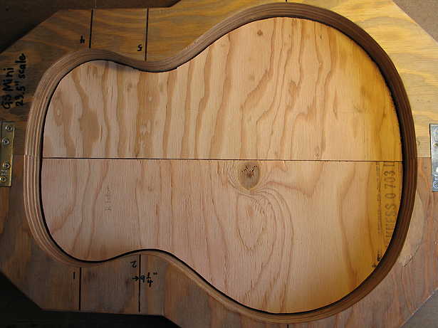 Below you can see the bending form halves set inside the mold. I have slightly overcut the neck and tail ends of the bending forms, to account for the springback that usually occurs after you've bent the sides.