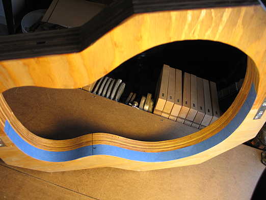 Today it occurred to me that I should put a support bar in the bending form, to provide added support at the waist, when the waist caul is cranked down onto the form. So, I got some 3/16" square bar stock, cut it down to 6" in length, and epoxied it into two slots I had sawn, chiseled, and filed into the bending form.