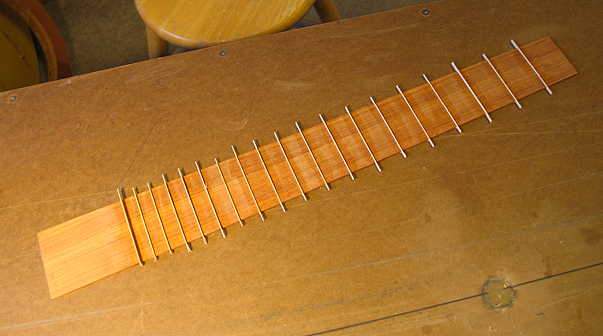 The first thing I did today was to thin the fingerboard to 1/8", which is what the plans called for. Then I inlaid the maple purfling into the fret slots, using Titebond. (I first smeared some Titebond into the slot and then slid the purfling into the slot.)