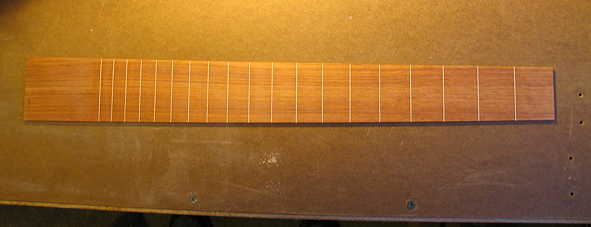 It turned out really nicely. The white purfling lines look really nice and crisp against the granadillo wood of the fingerboard. It will look even nicer once the fingerboard is bound with the bloodwood (which I must wait to do until later, after the soundbox is complete and I can tell exactly where I need to trim the end of the fingerboard at the soundhole) and once the fingerboard is oiled.