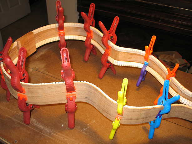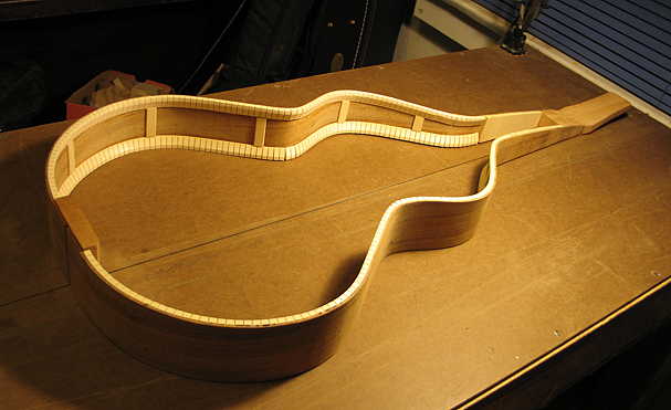 Here is the completed side set. Now what I need to do is sand the inside of the side set, and move on to sanding the kerfings to accept the top and the back (I have a slight 25' radius on both the top and the back, the top only radiused below the soundhole). Then I will mark where the braces meet the sides so I can rout out the little pockets where the brace ends will tuck into the kerfing, thus fitting the top and back to the sides.