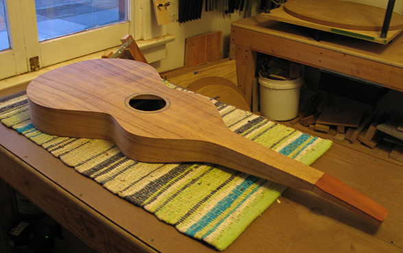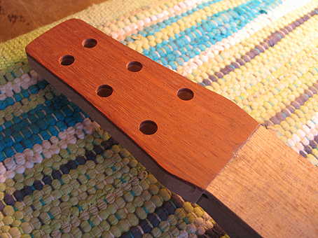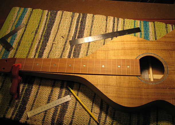 One last photo for today: I inlaid the fingerboard position dots and trimmed the end of the fingerboard: